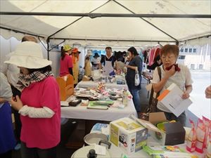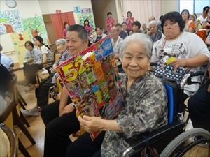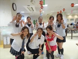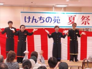 初ブログです ^v^昨日8/3(日)に、『けんちの苑夏祭り』が開催されました。模擬店では、焼きそばに大判焼き、お赤飯にフランクフルトにかき氷などなど大盛況☆★ 少~しビールを飲んでほろ酔い気分の利用者様もいらっしゃいました。もちろんバザーも大盛況で、みなさん掘り出し物を探すのに大忙し・・・ 射的や輪投げのコーナーは、子供達はもちろん大人までもが童心に返り、真剣に遊んでいました。イベントではお囃子と和踊りの2組のボランティアの方々が来て下さり、夏らしい楽しい一時となりました。デイケア職員によるリズム体操でからだをほぐした後は、本日の目玉です。学ランを着た「けんちの苑氣志團」によるマブダチの踊りと、「けんちの苑の元高校生」による、AKB48の恋するフォーチュンクッキーのダンスを披露しました。セーラー服を着た20才~30代の元高校生、目を細めて見ればナントカ高校生にみえましたよ^〇^ 最後のお楽しみ抽選会では、商品券や花火やホームベーカリーなど、豪華商品が多くの方に当たりました。こうして、今年の夏祭りも事故もなく無事に幕を閉じる事が出来ました。模擬店やバザーのボランティアの皆様、芸能ボランティアの皆様、ご家族の皆様、近隣の皆様、バザーにご協力いただいた方々のお陰だと感謝しております。ありがとうございました。11月には秋祭りを開催する予定ですので、どうぞよろしくお願いいたします。