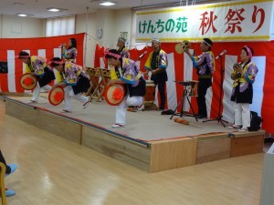 11/16(日)秋晴れの中、毎年恒例のけんちの苑秋祭りが開催されました。模擬店では大好評大判焼きにプロの味焼きそば、新メニューのかき玉うどん、アツアツおでん、フランクフルトに赤飯に果物やビールやジュース・・・どれもこれも美味しくて大好評!! バザーではお洒落な利用者さんが洋服選びを楽しんでいました♪ 展示コーナーも大好評で、熱心に作品を眺めて手に取って、作り方を聞いている方や購入する方続出☆☆ イベントは坂東市から『八木節保存の会』の皆様が来て下さり、八木節の太鼓や唄や踊りを披露して下さいました。太鼓や歌ももちろん素晴らしかったですが、唄があまりにも上手で、テープが流れていると思った位です★★ 続いて、自称イケメン3人組によるゴールデンボンバーのダンスに大爆笑(^O^) デイケア職員によるリズム体操は、入場から退場まで楽しませてくれ、体もほぐれました♪ AKB48の衣装を着たヘビーローテーションのダンスも可愛くて、本物のAKBが来たと勘違いする人も・・・^△^ 最後に八木節保存の会の皆様と職員で、これから音頭を踊りながら会場内を練り歩き、終わりました☆ お楽しみ抽選会では多くの商品が用意され、みんな自分の番号札とにらめっこしながら待っていました。1等のオーブンレンジを当てたのは、2階入所者様のご家族!! おめでとうございま~す(^▽^) 何も当たらなかった方も残念賞で景品が貰えますよ~^○^ 今年の秋祭りも事故もなく盛大に終わる事が出来ました。今回ご協力頂いたボランティアの皆様、業者関係の皆様、近隣の皆様、ご家族の皆様、バザー品を提供して下さった皆様、本当にありがとうございました。おかげ様で、利用者様の素敵な笑顔をたくさん見る事が出来ました。また来年も、是非ご協力ご参加お待ちしておりますo(^▽^)o